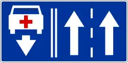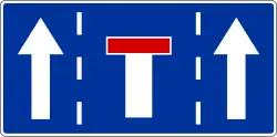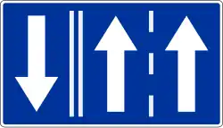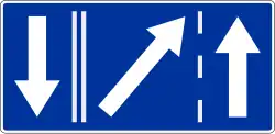 F-16: koniec pasa ruchu na jezdni dwukierunkowej | Uprzedza o końcu wewnętrznego pasa ruchu na jezdni wskazanej na znaku. | |||||||||||||