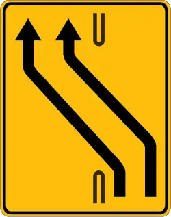 F-17: koniec pasa ruchu na jezdni jednokierunkowej | Uprzedza o końcu wewnętrznego pasa ruchu na jezdni wskazanej na znaku. | |||||||||||||