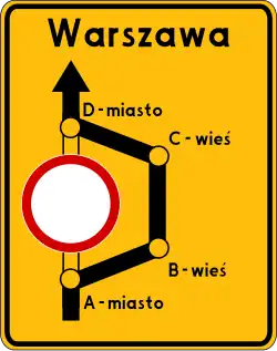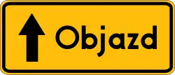 F-8: objazd w związku z zamknięciem drogi | Wskazuje wyznaczony objazd; jeżeli na znaku F-8 umieszczono znak zakazujący wjazdu określonych pojazdów, oznacza to, że objazd dotyczy pojazdów wskazanych na znaku zakazu. | |||||||||||||