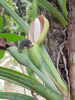 - W swoim naturalnym środowisku jest to kilkumetrowej długości pnącze wspinające się po pniach drzew tropikalnej dżungli i czepiające się ich korzeniami. Uprawiane w mieszkaniach odmiany osiągają wysokość do 1,5 m. W ciągu roku w mieszkaniu roślina przyrasta około 30 cm i wytwarza 6–7 liści.