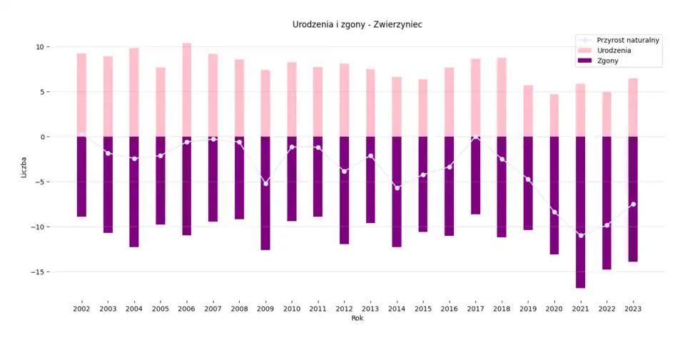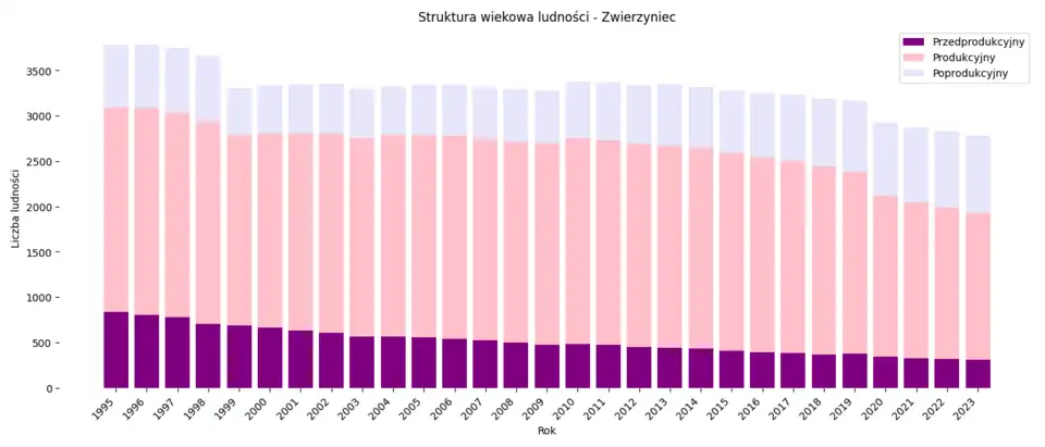 Liczba ludności Zwierzyńca w latach 1995–2023 w podziale na grupy ekonomiczne[25].