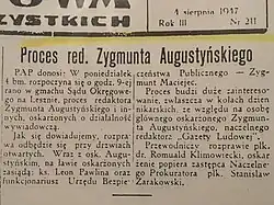 - ↑ Proces pokazowy Zygmunta Augustyńskiego w świetle wybranej prasy polskiej | HISTORIA.org.pl – historia, kultura, muzea, matura, rekonstrukcje i recenzje historyczne [online], historia.org.pl [dostęp 2018-08-11] (pol.).