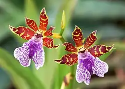 - Jeden kwiat zawiera 5 podłużnych listków okwiatu i jeden, szeroki skierowany w dół. Górne są jednolite z jasnym konturem lub nakrapiane. Duży dolny listek okwiatu jest zwykle dwubarwny, np. koloru białego i fioletowego lub purpurowego.